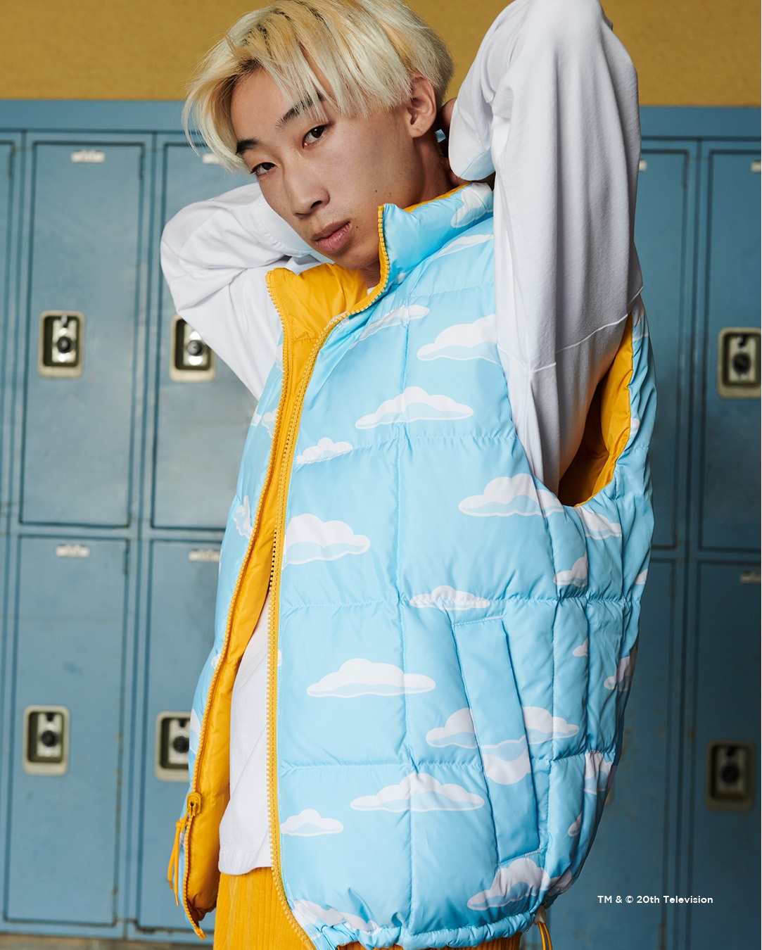 이번 콜라보레이션은 팝 문화를 크게 살린 스트리트웨어에서 영감을 받은 특별한 컬렉션을 선보이고 있다. 구름 프린트의 리버시블 패딩 베스트, 심슨 그래픽 티셔츠, 데님 자켓, 심슨 가족 프린트의 버킷햇, 힙색 등 MZ세대의 감성을 자극하는 키치한 제품들로 구성되어 있다.