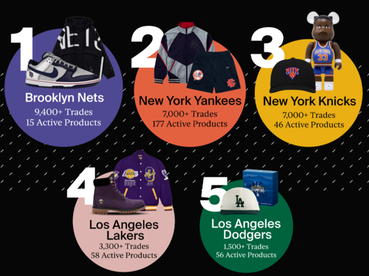 최근 12개월 동안 5회 이상 거래된 제품 기준, 키스(Kith), 뉴에라(New Era) 그리고 슈프림(Supreme) 은 콜라보레이션 제품을 가장 많이 출시한 브랜드로 밝혀졌으며, 스탁엑스(StockX)에서 거래된 팀 콜라보레이션 제품은 550개 이상이었다. 이는 전년 동기 대비 70% 증가한 수치이다. 50개의 브랜드가 팀과의 콜라보레이션을 진행했고, 38개의 팀이 브랜드와 콜라보레이션을 했다.