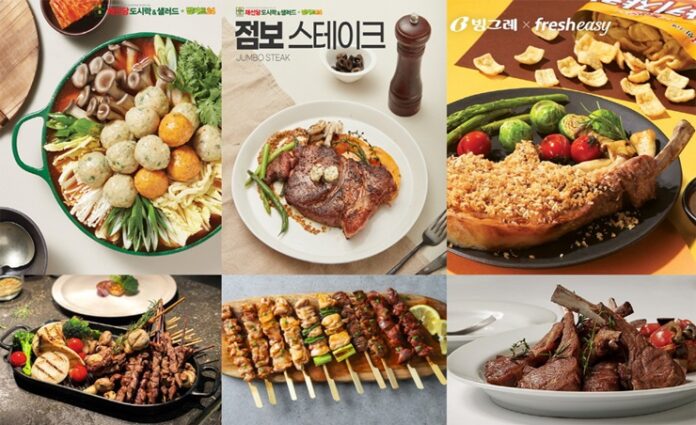 프레시지는 빙그레와의 협업을 통해 바삭한 크럼블을 토핑한 ‘쟈키쟈키 돈마호크 스테이크’를 선보였다. 부드러운 식감과 풍성한 육즙을 자랑하는 100% 국내산 돈마호크에 인기 스낵인 ‘쟈키쟈키’ 맛 시즈닝 빵가루를 더한 제품으로, 숯불갈비 소스, 방울양배추, 총알새송이버섯, 아스파라거스, 방울토마토 등 푸짐한 구성이 돋보인다.