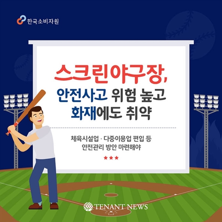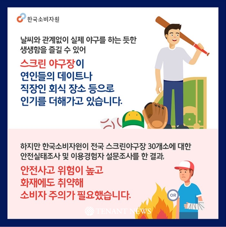 스크린야구장이 연인들의 데이트 또는 직장인 여가시간 활동·레저 장소로 인기를 더해가고 있다. 그러나 한국소비자원(원장 이희숙)의 전국 스크린야구장 30개소에 대한 안전실태조사 및 이용경험자 설문조사 결과, 안전사고 위험이 높고 화재에도 취약해 이용시 주의가 필요한 것으로 나타났다.