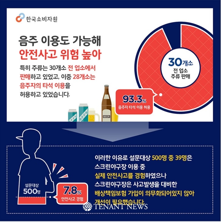 특히 30개소 전 업소에서 주류를 판매하고 있었고, 이중 28개소(93.3%)에서는 음주자의 타석 이용이 허용되고 있었다. 실제로 설문대상 500명 중 39명(7.8%)은 스크린야구장 이용 중 안전사고를 경험한 것으로 나타났으나, 스크린야구장은 사고발생을 대비한 배상책임보험 가입이 의무화되어 있지 않아 개선이 필요한 것으로 나타났다.