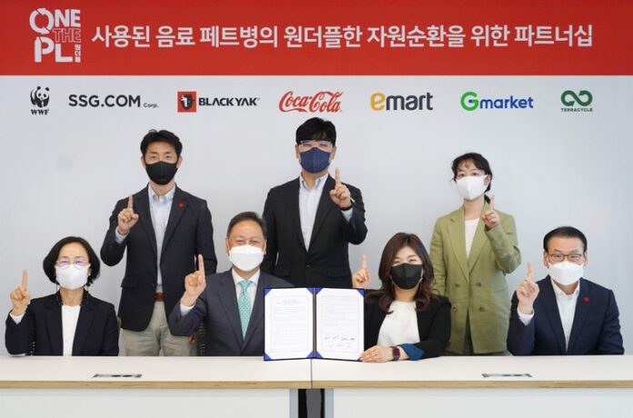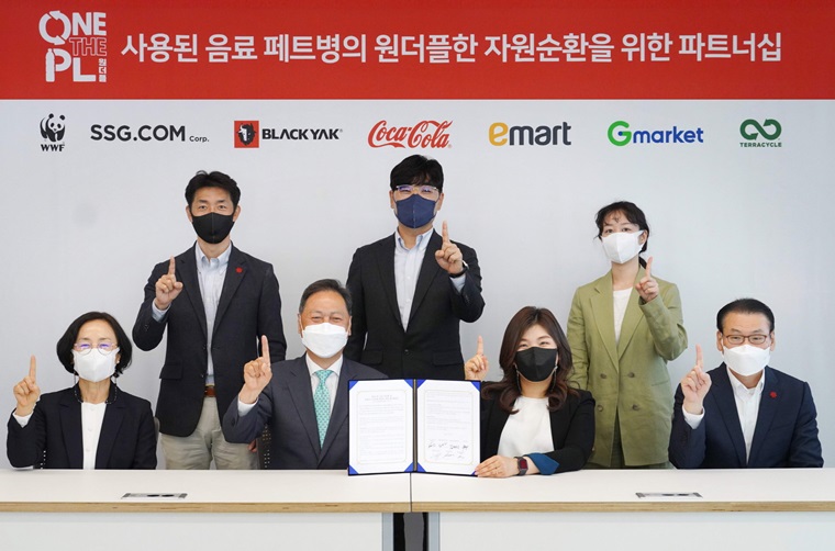 앞줄- 강태선 비와이엔블랙야크 회장, 최수정 한국 코카-콜라 대표, 형태준 이마트 지속가능혁신센터 부사장, 뒷줄-이유정 테라사이클 한국 총괄 팀장, 염성식 SSG닷컴 ESG 담당, 서민석 지마켓글로벌 부사장(커뮤니케이션 부문), 홍윤희 세계자연기금 한국본부 사무총장