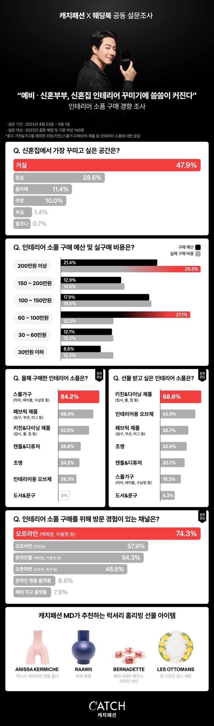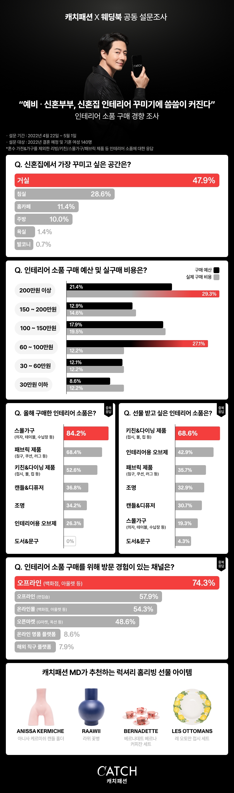 100% 공식 럭셔리 ‘캐치패션’은 지난 4월 22일부터 5월 1일까지 10일간 결혼 준비 필수 앱 ‘웨딩북’과 함께 올해 결혼 예정 및 기혼 여성 140명을 대상으로 ‘인테리어 소품 구매 경향’에 대한 설문조사를 진행했다.