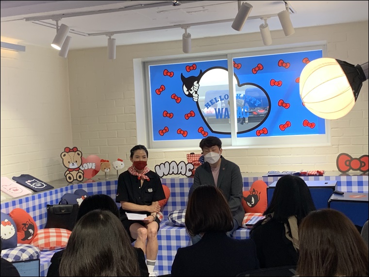 12일 열린 헬로키티’와 캡슐 컬렉션 런칭 및 팝업스토어 오픈 기념 프레젠테이션.(사진 왼쪽 김윤경 대표와 이준흠 BM)