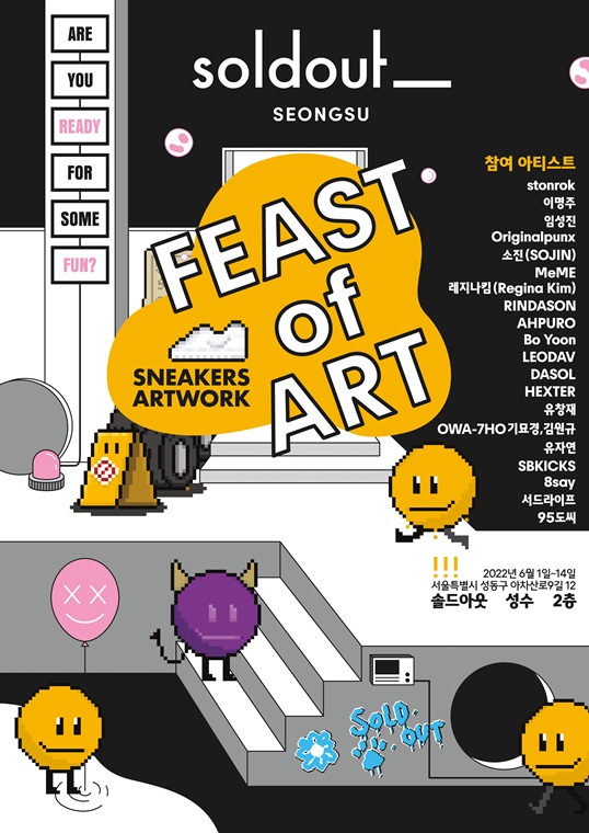 이번 특별전은 ‘예술의 향연(The Feast of Art)’이란 주제로 서울 성수동에 자리잡은 오프라인 전시 공간이자 스토어인 ‘솔드아웃 성수’에서 14일까지 열린다. 일러스트레이션, 아트토이, 그래피티 등 다양한 분야에서 활동중인 국내 아티스트 20인이 각자의 개성과 취향을 담아 전 세계에 하나뿐인 특별한 스니커즈를 선보인다.