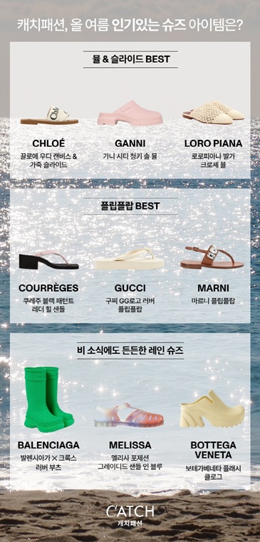 캐치패션(대표 이우창, CATCH FASHION)에 따르면, 5월 들어(5/1~7/6) 샌들, 슬리퍼 등의 여름 슈즈 거래액이 전년 동기 대비 75% 증가했다. 특히 간편하지만 다채로운 컬러와 스타일을 반영한 뮬, 슬라이드, 플립플랍 등이 인기다.