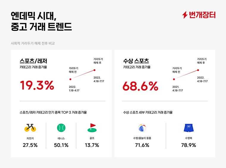 취향 중고거래 앱 번개장터(대표 최재화)가 엔데믹 이후 사용자들의 중고 거래 트렌드를 조사한 결과, 사회적 거리두기 해제 후 3개월간(4월18일~7월17일) ‘스포츠ㆍ레저’ 카테고리 전체 거래액이 해제 전 3개월(1월18일~4월17일) 보다 19.3% 증가한 것으로 나타났다.