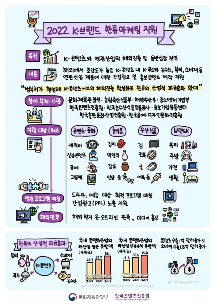 문화체육관광부(장관 박보균)와 한국콘텐츠진흥원(원장 조현래, 이하 콘진원)은 전 세계적으로 인기를 끌고 있는 K-콘텐츠와 연관 산업의 해외 진출을 도모하기 위한 ‘K-브랜드 한류마케팅 지원사업’을 본격 추진한다.