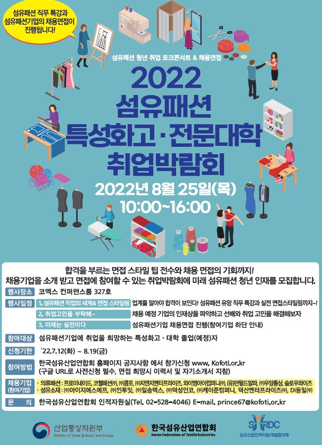 한국섬유산업연합회(회장 이상운)가 운영하는 섬유산업 인적자원개발협의체(이하 섬유SC)는 오는 8월 25일(목) 코엑스 컨퍼런스룸 327호에서 ‘섬유패션 특성화고·전문대학 취업박람회’를 개최한다.