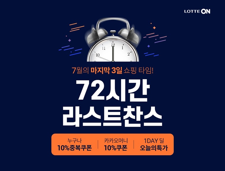 롯데온은 29일부터 31일까지 여름 휴가 필수 상품을 할인 판매하는 7월 ‘72시간 라스트찬스’ 행사를 진행했다. ‘72시간 라스트찬스’는 매월 마지막 3일동안 한 달간 가장 많은 사랑을 받았던 상품을 모아 할인 혜택을 제공하는 행사다. 이 달에는 여름 휴가를 준비하는 고객들을 위한 다양한 상품을 모아 최대 72% 할인 판매한다. 행사기간 최대 10% 할인 쿠폰 및 카카오페이머니로 결제 시 사용할 수 있는 추가 10% 할인 쿠폰도 제공되었다.