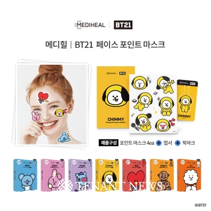 마스크팩 브랜드 ‘메디힐’은 원하는 부위를 집중 관리할 수 있는 ‘BT21 포인트 마스크’를 출시했다. 깜찍한 방탄소년단 캐릭터 디자인이 돋보이는 이 마스크팩은 캐릭터별로 피부 윤기 강화, 윤광, 물광, 진정, 활력, 비타민 케어 기능이 들어가있다. 외출 전 유난히 화장이 잘 뜨는 턱밑, 두뺨 등에 붙일 수 있고 응급 상황에서 즉각적인 케어가 가능하다.