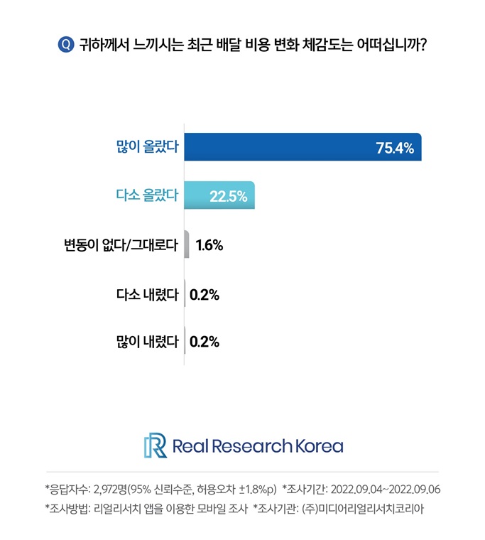 리서치 전문 기업 미디어리얼리서치코리아가 지난 4일부터 6일까지 대한민국 성인남녀 2,972명을 대상으로 ‘음식 배달 비용 변화 체감도’에 대한 설문조사를 실시했다. 결과에 따르면 응답자의 75.4%가 배달 비용에 대해 ‘많이 오른 것을 체감한다’고 답한 것으로 나타났다.