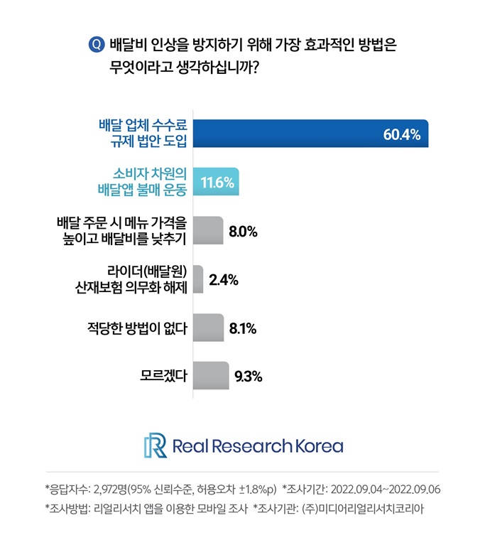 다음으로 잇따른 배달비 인상을 방지하기 위한 효과적인 방법에 대해서는 ’배달업체 수수료 규제 법안을 도입해야 한다’는 의견이 60.4%로 가장 높은 것으로 나타났다.