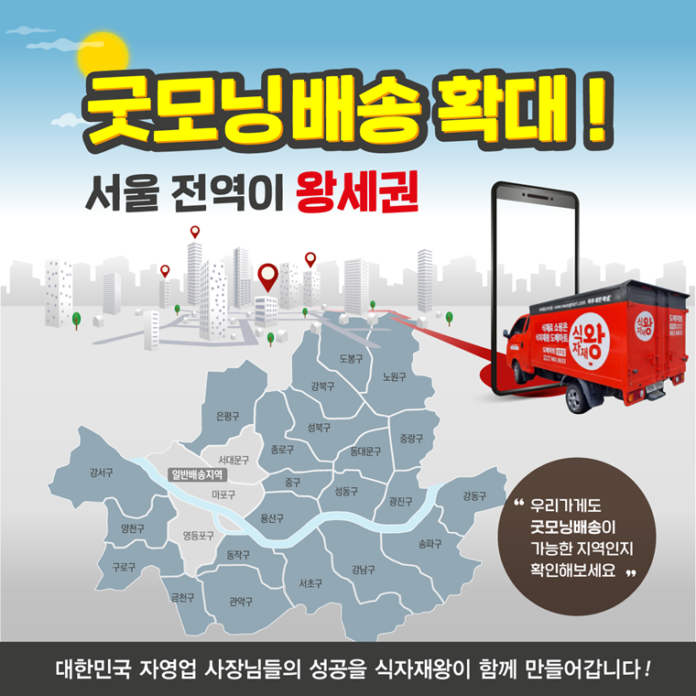 대한민국 자영업 사장님들의 성공 파트너 식자재왕 도마매트가 B2B 식자재 아침배송 서비스 ‘굿모닝배송’의 배송지를 늘리며 직영몰 ‘식자재왕 온라인몰’의 배송 서비스를 서울 전역으로 확대한다.