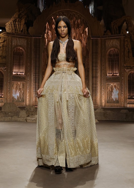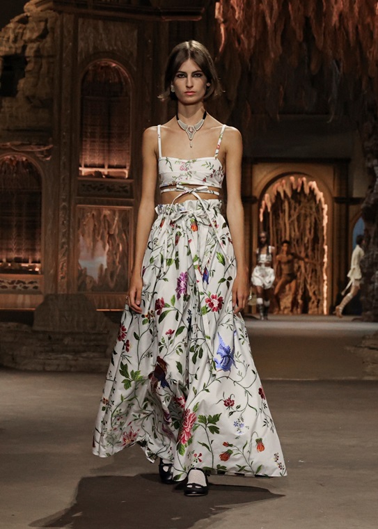 꽃과 새 모티브를 장식한 라피아 코트는 바로크 동굴을 재해석한 아티스트 에바 조스팽(Eva Jospin)의 패션쇼 무대 배경과 만나 한층 풍성한 매력을 자아낸다.
