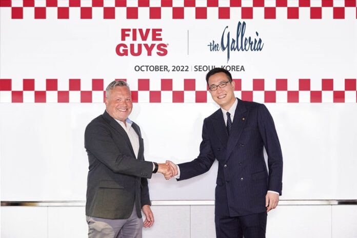 갤러리아백화점은 신규 사업의 일환으로 미국에서 가장 사랑 받는 버거로 불리는 ‘파이브가이즈’를 선보인다. 갤러리아는 6일 ‘파이브가이즈 인터내셔널(FGE International)’과 국내 사업권 계약 관련 약정서를 체결, 내년 상반기에 ‘파이브가이즈’ 국내 1호점을 오픈한다고 밝혔다.