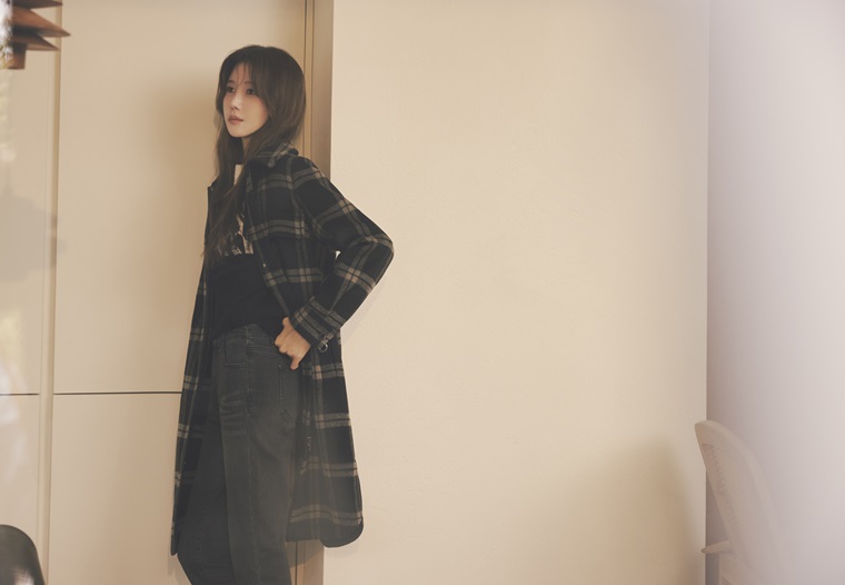 이지아는 롱 코트 스타일로 ‘코트 여신’ 다운 면모도 보여줬다. 블랙과 딥 그레이가 섞인 체크 패턴의 롱 코트는 무채색의 차분함이 느껴지며, 헤링본 소재의 울 코트는 슬림핏으로 도시적인 세련미를 완성시켰다.
