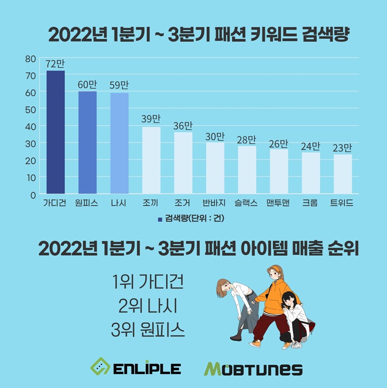 키워드 데이터 분석 결과, 올해 9월까지 가장 많이 검색된 패션 관련 키워드는 ‘가디건’(약 72만 회 검색)이다. 두 번째로 많이 검색된 키워드는 ‘원피스’, 그 뒤를 이어 ‘나시’, ‘조끼’, ‘조거 팬츠’, ‘반바지’, ‘슬랙스’, ‘맨투맨’, ‘크롭’, ‘트위드’ 순으로 검색 수가 많았다.