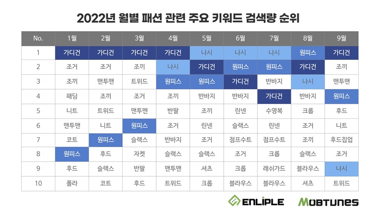 가디건은 올해 9월까지 매월 4위 안에 드는 인기 아이템으로 꼽혔으며, 이는 모든 계절 활용도가 높기 때문인 것으로 분석한다. 날이 더워지는 5월부터 8월까지는 나시와 원피스 월별 검색량이 각 10만 회 이상으로 대폭 늘어났다. 봄, 가을철 검색량에 비하면 약 5배다.