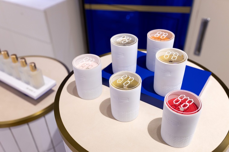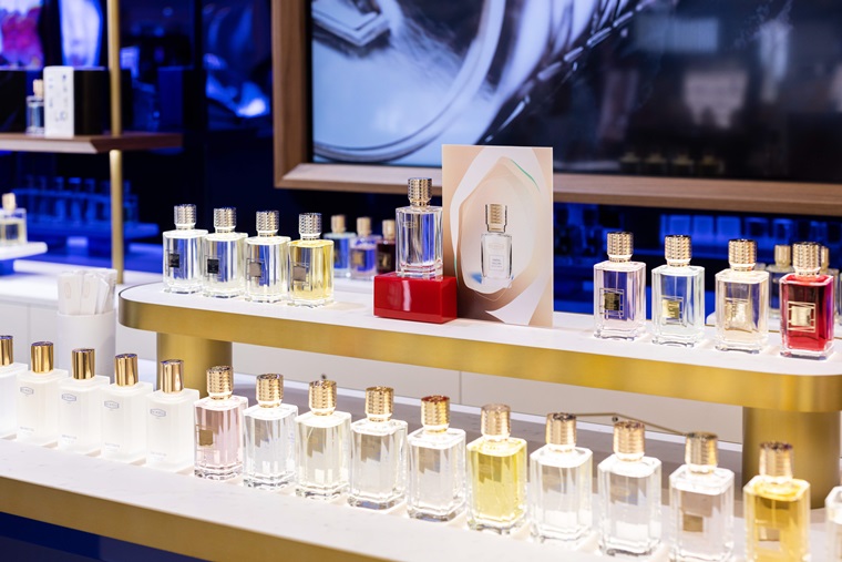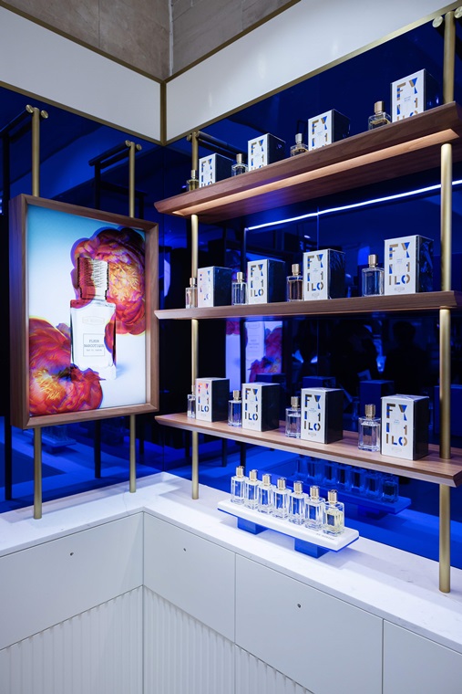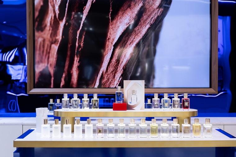 파리에 위치한 플래그십 스토어와 동일하게 현대적인 블루 미러와 화이트 대리석, 메탈 브라스를 활용한 인테리어로 하우스의 철학과 후각적인 경험에 몰입할 수 있도록 디자인됐다.