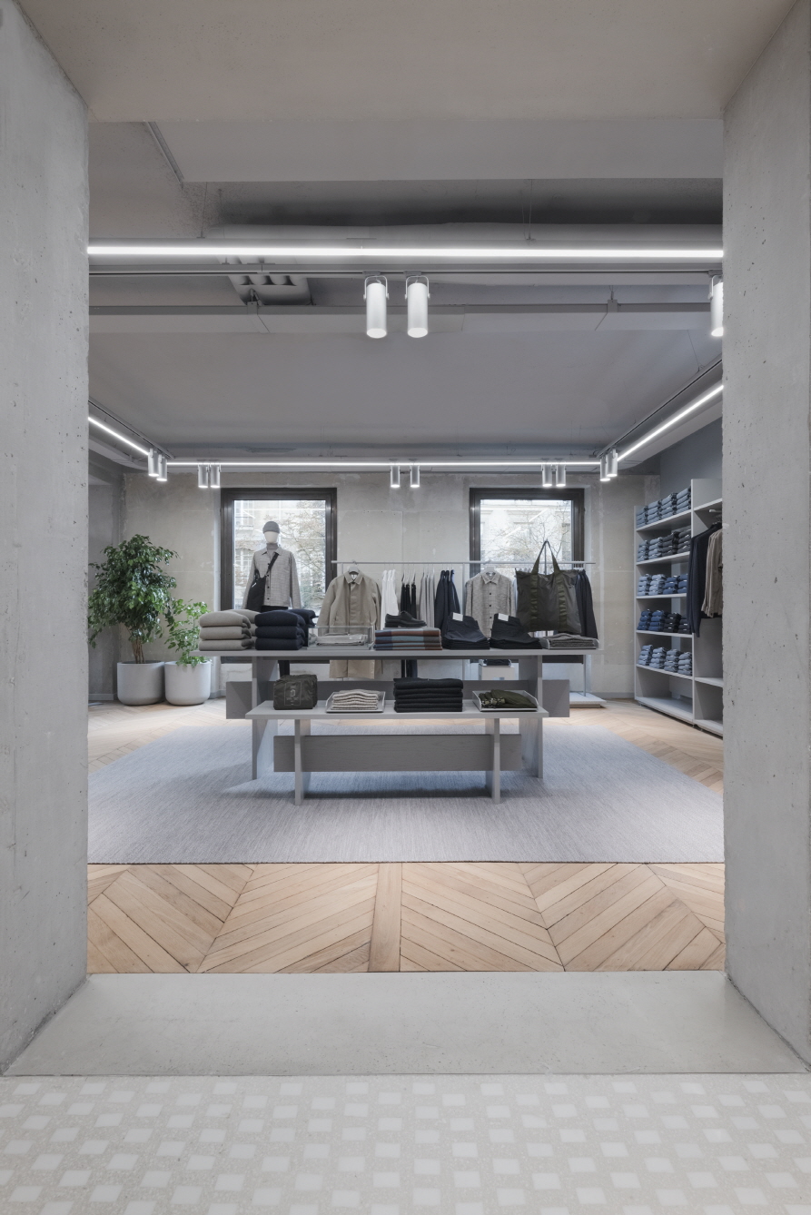 총면적 400제곱 미터에 달하는 아르켓 파리 스토어는 6층 건물에 두 개 층으로 구성되어 있으며, 기존 건물의 건축 양식에 브랜드 특유의 모노크롬 인테리어가 어우러질 수 있도록 하였다. 1층의 모자이크 테라초 바닥재는 그대로 보존하였으며, 2층의 목재 바닥은 원래의 형태를 최대한 유지함과 동시에 세심하게 복원되었다. 지속 가능한 식물성 결합재를 통해 만들어진 스토어의 테라초 바닥재는 기존 건축물의 독창적인 요소들과 자연스럽게 어우러진다.