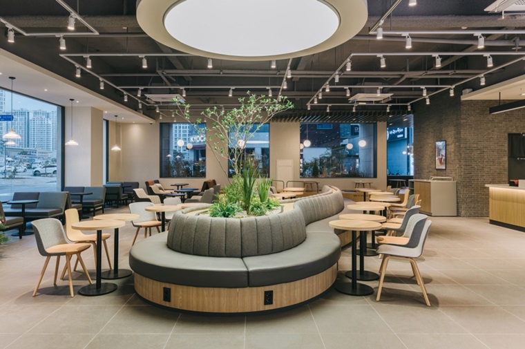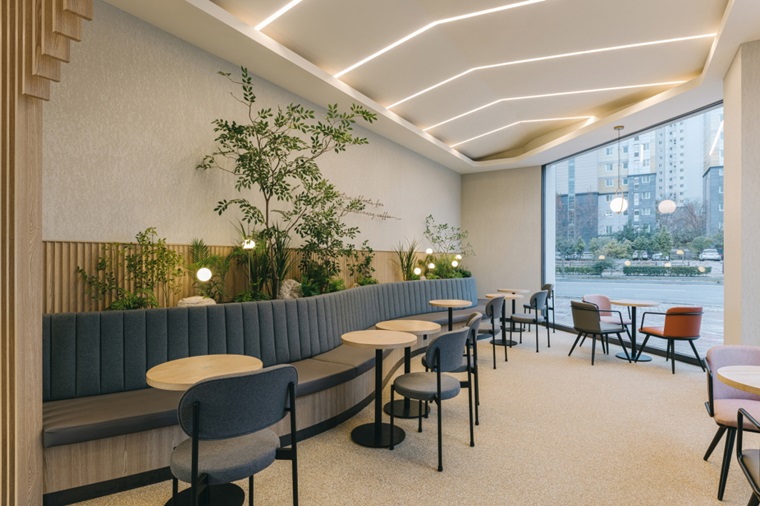 매장 중앙에는 커다란 원형 조명과 곡선형 좌석, 플랜테리어로 부드럽고 자연스러운 분위기를 연출했다. 매장 오른쪽에는 우드 파티션으로 공간을 분리해 곡선형 좌석과 작은 정원, 조명이 있는 통창 좌석을 꾸며 ‘공간 속 공간을’ 조성했다. 또한 좌식 공간에는 아이 동반 가족도 즐길 수 있어, 전 연령층의 고객 모두가 편안히 휴식할 수 있는 매장을 완성했다.