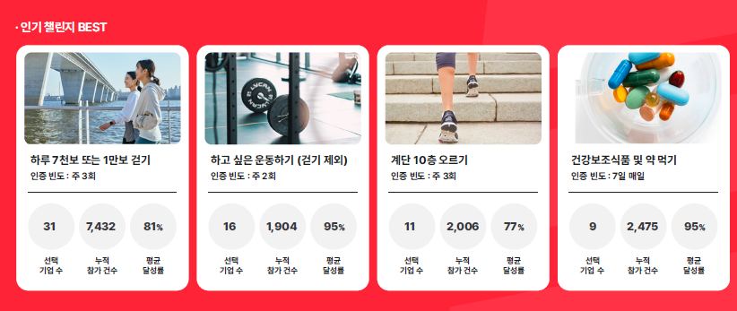 화이트큐브가 운영하는 건강습관 앱 ‘챌린저스’도 임직원 건강관리 습관 형성 서비스로 각광받고 있다. 기업에서 건강관리를 위해 가장 많이 선택하는 챌린지는 하루 7천보 또는 1만 보 걷기 챌린지이며, 누적건수는 7,432건에 달한다. 이 외에도 하고 싶은 운동하기, 건강보조식품 및 약 먹기 등 혼자 했을 때 지속하기 어려운 건강 행동들을 동료들과 즐겁게 이어나가도록 돕고 있다.