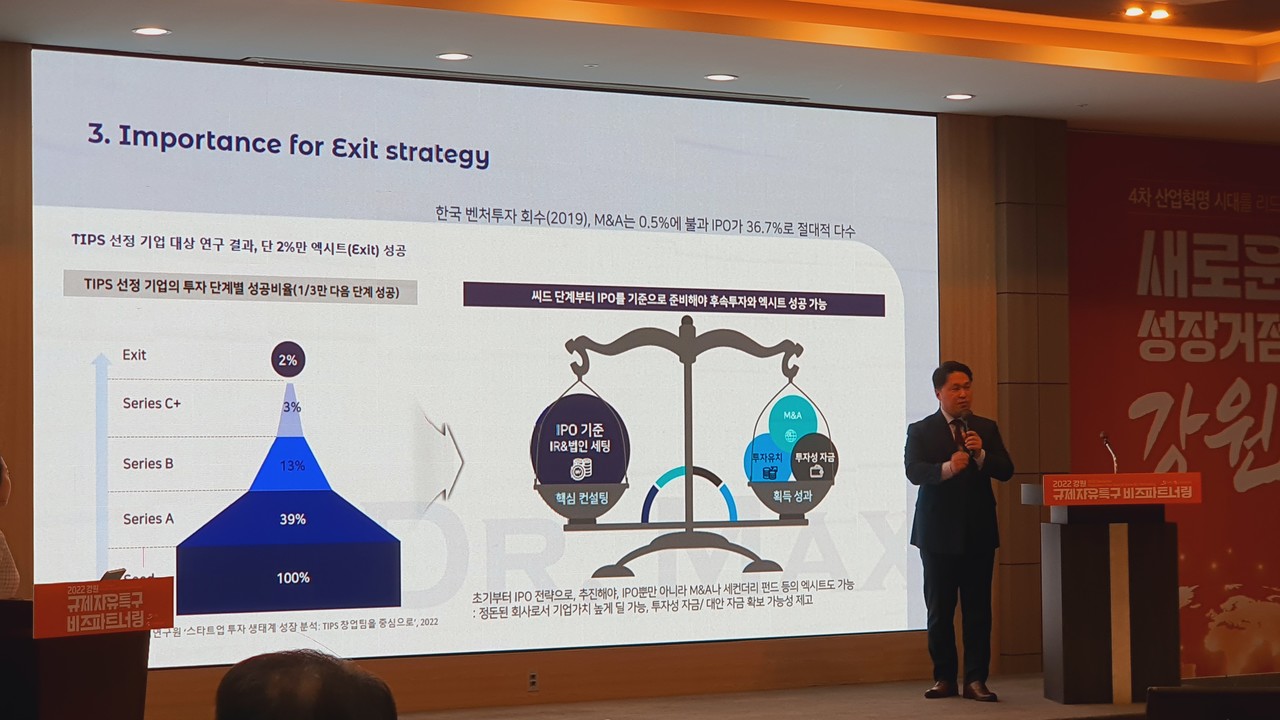 아이피오 브릿지 임병을 대표는 “‘벤처·스타트업 투자유치 전략’강연 세션에서, 투자유치를 받으려면 우선 IPO(기업공개, 국내 벤처·스타트업은 주로 코스닥 상장을 추진 함)를 목표로 설정한 후 이를 달성하기 위한 방안을 투자유치용 IR 자료에 담으면 반드시 성공하는 IR 전략이 될 것”이라며 엑시트 목표를 IPO(코스닥 상장)로 설정, 달성할 코스닥 상장요건을 정하고 연도별 목표치 설정(Macro KPI), 각 연도별 Macro KPI를 달성하기 위해 선행되어야할 사업 운영 지표 설정(Micro KPI), 이를 뒷받침하는 프레임으로 3M(Money, Matter, Model)적용 등 4가지 핵심 팁을 제시했다.