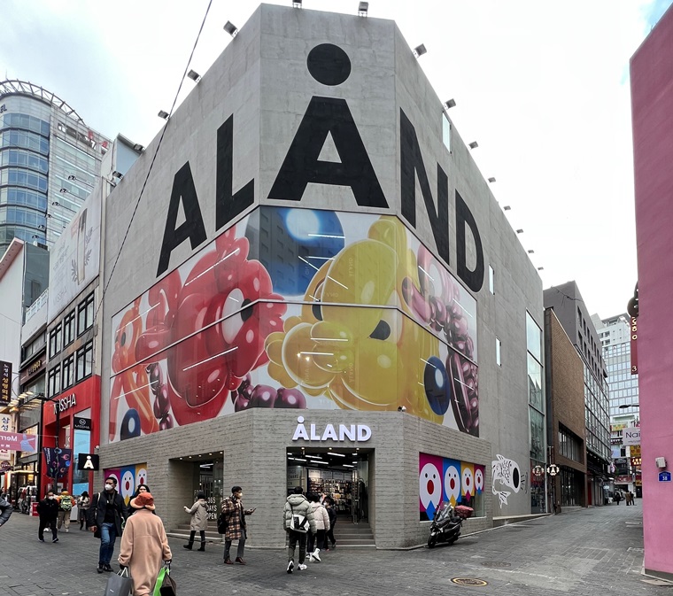 썰렁하던 명동 상권에 패션 매장으로써 포문을 연 브랜드는 패션 편집숍 ‘에이랜드’이다. ‘에이랜드’는 지난해 4월 사회적 거리두기가 해제된 직후 5월에 명동 중앙로에 400평 규모의 매장으로 재오픈했다. 1~4층 규모의 매장으로 직전에 아이다스가 플래그십스토어로 쓰던 매장이다.