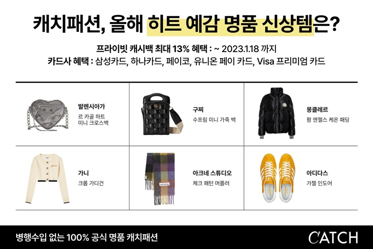 병행수입 없는 100% 공식 명품 플랫폼 캐치패션(대표 이우창, CATCH FASHION)이 2023년 해외 브랜드 신상 아이템을 다양하게 큐레이팅하여 선보이며, 새해 맞이 고객 혜택을 마련했다.