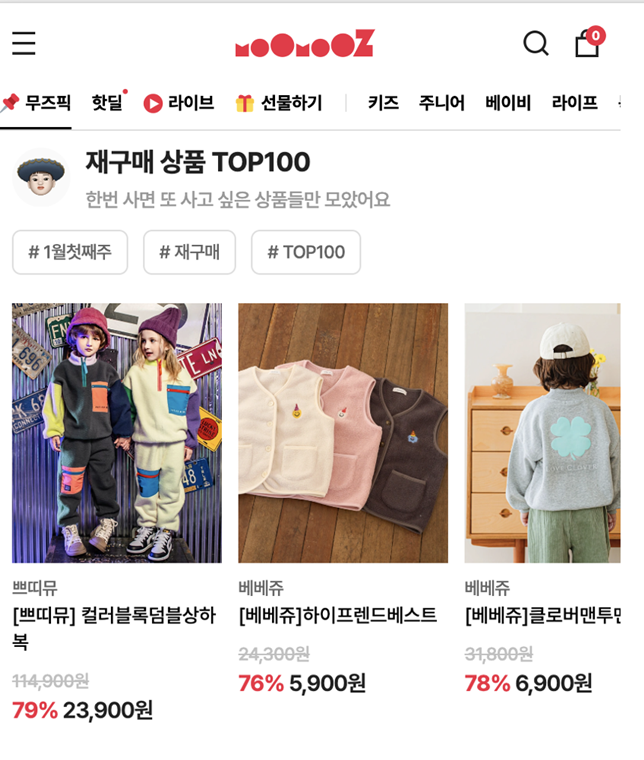 재구매 상품 TOP 100은 무무즈 입점 브랜드 1천여 개 중에서 상품 판매 순위, 고객 후기, 트렌드 등을 기준으로 선정된 상품으로 최대 81% 할인가로 구매 가능하다.