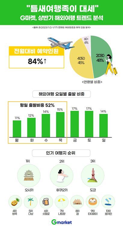 약 3년만에 하늘길이 열리면서 가까운 해외로 틈틈이 떠나려는 일명 ‘틈새여행족’이 대세로 떠오르는 모양새다. 국내 대표 온라인 마켓플레이스 지마켓이 올해 초(2023/1/2-1/17) 판매된 해외항공권 예약 현황을 분석한 결과, 예약 인원은 전월 대비 84% 증가했고, 평일 출발 비중도 50%를 넘겼다.