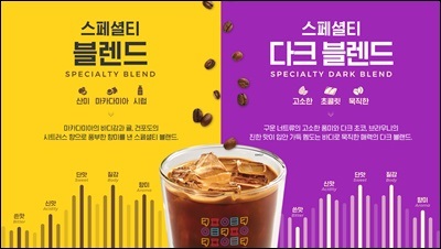 먼저 커피는 저가커피 브랜드에서는 유일하게 두가지 블렌드 원두 커피를 제공하고 있다. 산미와 고소한 맛 두가지를 제공하고, 원두의 수준도 프리미엄급의 스페셜티 커피로 교체했다.