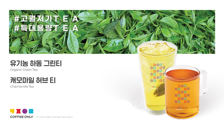 커피온리가 선보이는 스페셜티 커피는 산미가 있는 ‘스페셜티 블렌드’와 산미가 없는 묵직한 바디감을 제공하는 ‘스페셜티 다크 블렌드’ 두 종류로 나뉜다. 두 커피는 세계 상위 7% 원두만이 받을 수 있는 스페셜티 등급의 원두를 사용하고 있다. 커피온리는 두 블렌드에 9종의 커피 메뉴를 부담없는 가격에 제공하고 있다. 여기에 별도로 콜드브루, 디카페인 콜드브루 등도 출시해 선택의 폭을 넓혔다. 또한 커피온리는 티(TEA) 메뉴에서도 경쟁력을 갖췄다.