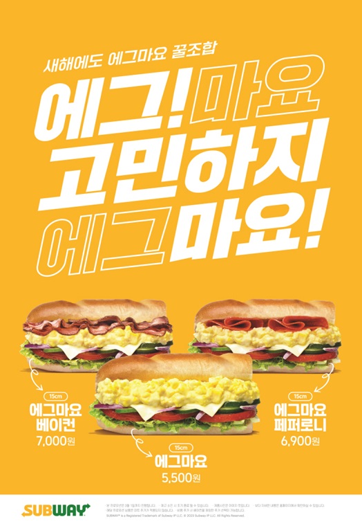 써브웨이(Subway®)는 새해를 맞아 ‘에그마요 꿀조합’을 내놓았다. 브랜드를 대표하는 ‘가성비 갑’ 메뉴이자 스테디셀러 샌드위치인 ‘에그마요’에, 검증된 꿀조합 추가 토핑을 각각 곁들인 ‘에그마요 베이컨’와 ‘에그마요 페퍼로니’가 더해진 총 3종 구성이다.
