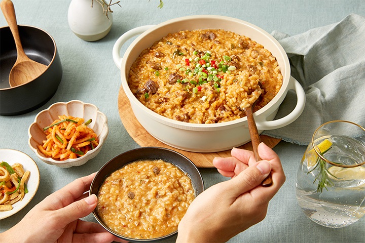 냉동 상태의 제품에 물 350ml만 담아 프라이팬이나 냄비, 전자레인지로 조리하면 간단히 완성된다. 계란을 더해 한소끔 끓여준 뒤 김가루와 참기름을 둘러 고소함을 곁들이면 된장 샤브샤브죽 스타일로 더욱 맛있게 즐길 수 있다.