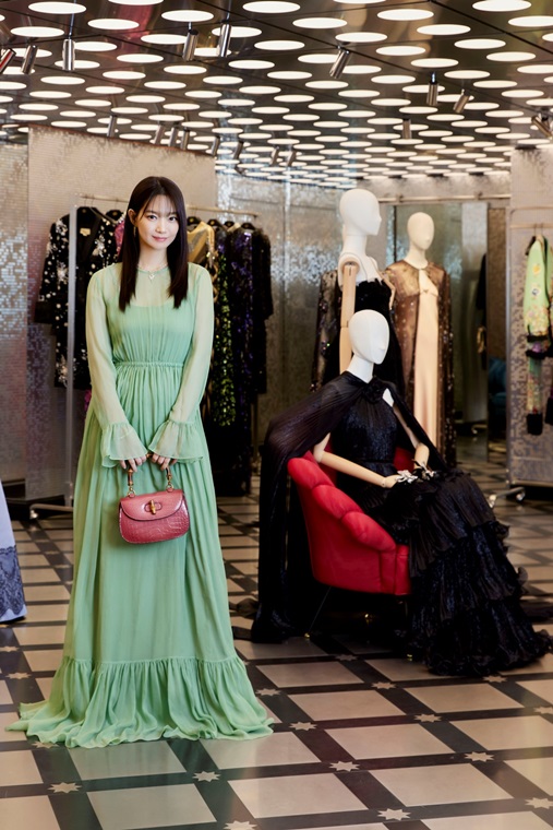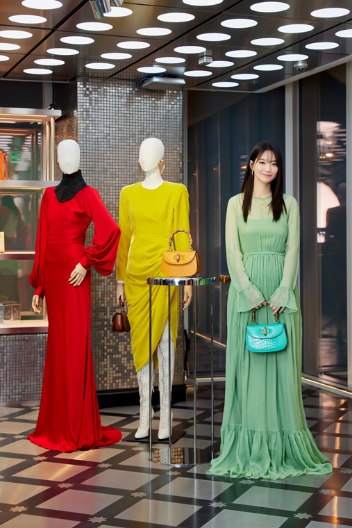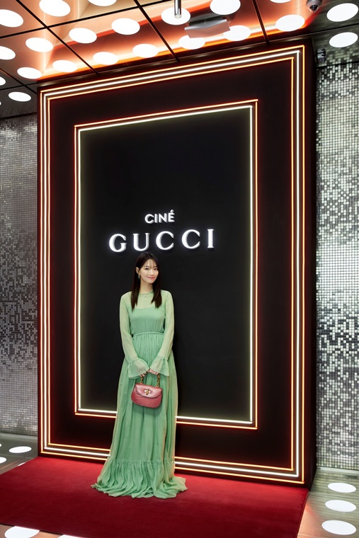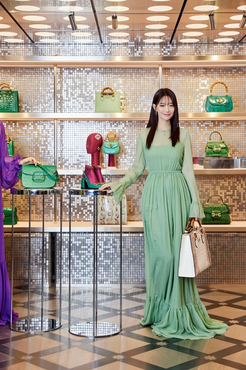 구찌 살롱 행사를 축하하기 위해 참석한 배우 신민아는 구찌 2023 크루즈 컬렉션에서 선보인 러플 디테일의 그린 실크 쉬폰 드레스를 입고 다양한 프레셔스 소재의 핸드백을 매치했다.