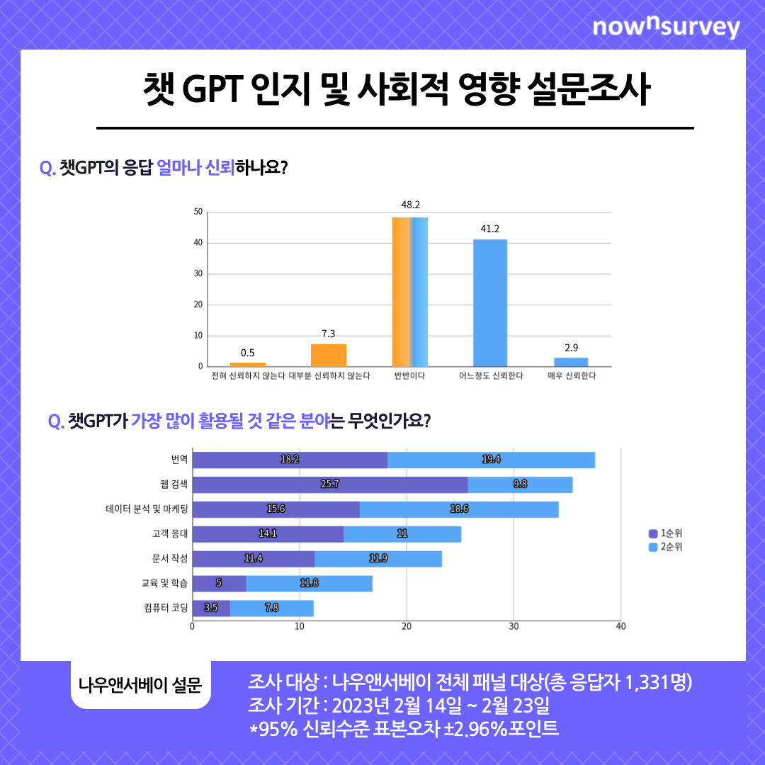 엘림넷 나우앤서베이는 챗 GPT에 대한 시민들의 인식을 파악하기 위해 설문조사를 실시하였다. 설문 기간은 2023년 2월 14일부터 2월 23일까지며 설문 응답자는 나우앤서베이 전국 패널 회원 총 1,331명이다.