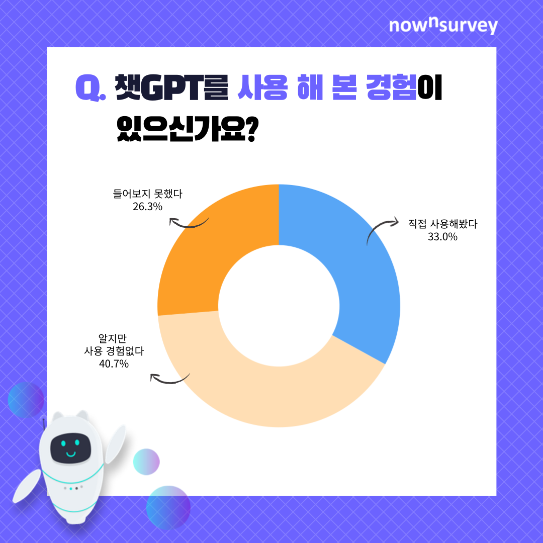 ‘챗 GPT에 대한 인지 및 사용 경험’에 대해 질문한 결과 ‘알지만 사용 경험 없다(40.7%)’, ‘직접 사용해봤다(33.0%)’, ‘들어보지 못했다(26.3%) 순으로 나타났다.