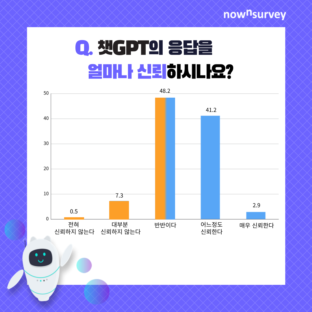 ‘챗 GPT의 응답에 대해 얼마나 신뢰하시나요?’라고 질문한 결과 절반에 해당하는 응답자가 ‘반반이다’(48.2%)라고 답변했다. 챗 GPT의 응답을 신뢰하는 응답자는 전체의 44.1%(‘어느 정도 신뢰한다’ 41.2%, ‘매우 신뢰한다’ 2.9%), 신뢰하지 않는 응답은 전체의 7.8%(‘대부분 신뢰하지 않는다’ 7.3%, ‘전혀 신뢰하지 않는다’ 0.5%)로 나타났다.