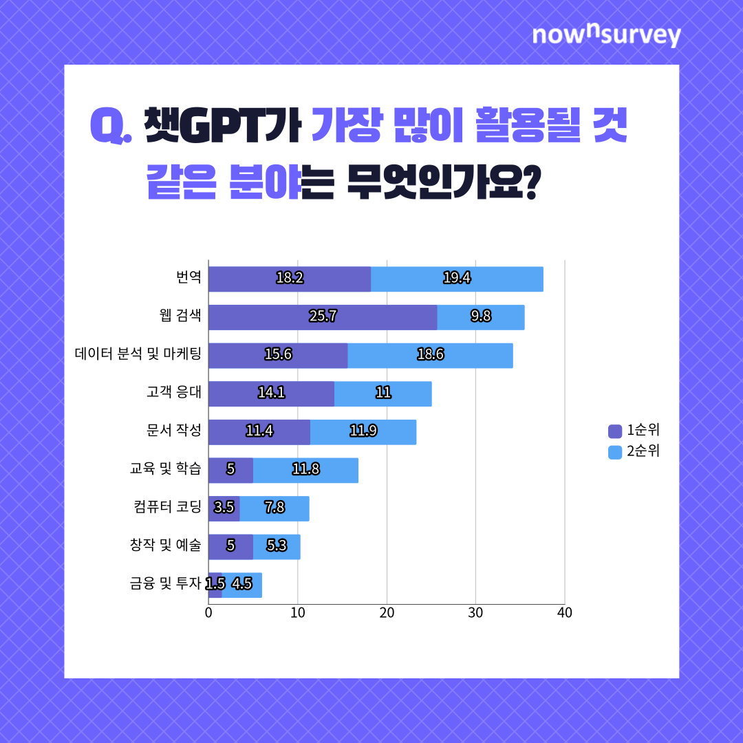 ‘챗 GPT가 가장 많이 활용될 것으로 생각되는 분야’에 대해 질문(1, 2순위 선택)한 결과 1~2위 선택 누적 기준으로 가장 많은 응답자가 ‘번역(37.6%)’을 선택했다. 그 뒤를 이어 ‘웹 검색(35.5%), ‘데이터 분석 및 마케팅(34.3%), ‘고객 응대(25.1%), ‘문서 작성(23.3%)’, ‘교육 및 학습(16.8%)’, ‘컴퓨터 코딩(11.3%)’, ‘창작 및 예술(10.2%)’, ‘금융 및 투자(6.0%)’ 순으로 나타났다.