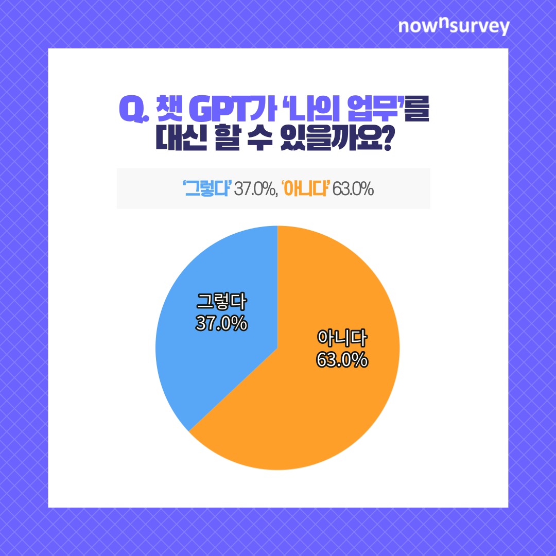 ‘챗 GPT가 본인의 업무를 대신할 수 있을 것으로 생각하시나요?’라는 질문에 대해 ‘예(37%)’, ‘’아니요'(63%)로 나타났다.