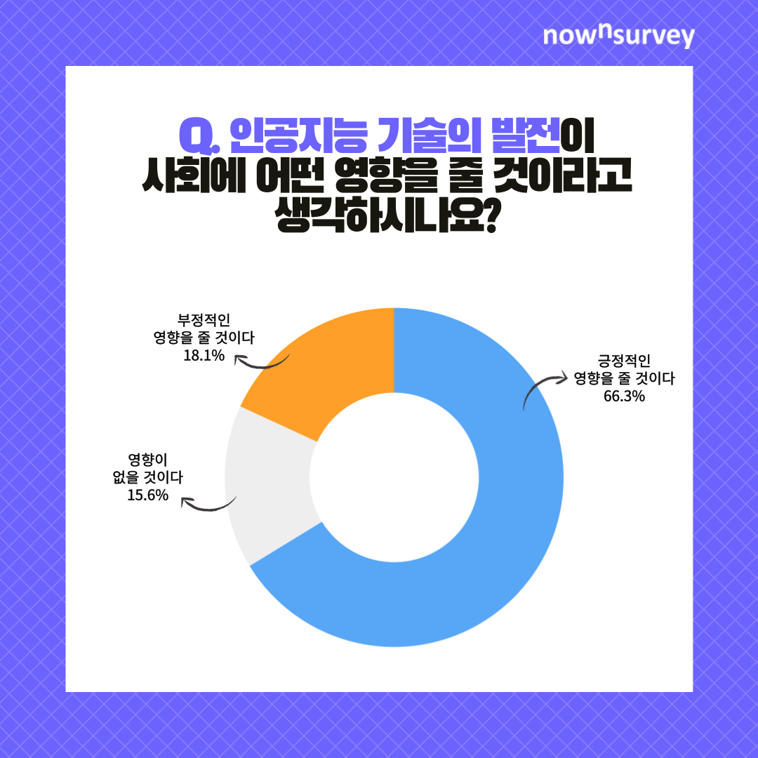 ‘인공지능 기술의 발전이 사회에 어떤 영향을 줄 것으로 생각하시나요?’라는 질문에 대해 ‘긍정적인 영향을 줄 것이다(66.3%)’, ‘영향이 없을 것이다(15.6%)’, ‘부정적인 영향을 줄 것이다(18.1%)’로 응답해 AI 기술에 대해 긍정적 응답이 부정적 응답 대비 3배 이상 많은 것으로 나타났다.