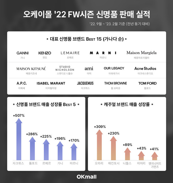 명품 이커머스 오케이몰(대표 장성덕)은 ’22년 9월부터 ’23년 2월 FW 시즌 매출 분석 결과 신명품 브랜드 15개의 매출액 성장률이 전년 동기 대비 35%에 달할 만큼 성장세가 돋보였다고 밝혔다.