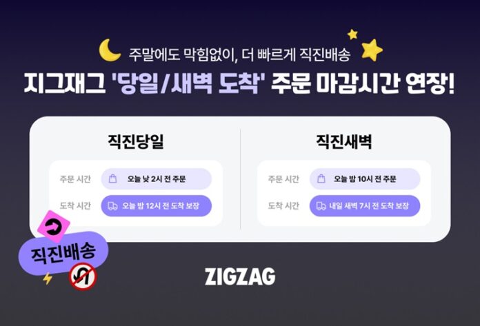 지그재그는 고객 편의를 극대화하기 위해 당일/새벽 도착 주문 마감 시간을 최대 4시간 연장했다. 이에 따라 서울 지역 거주 고객은 낮 2시 전까지 주문 시 당일 자정 전에, 밤 10시 전까지 주문하면 다음 날 새벽 7시 전에 상품을 수령할 수 있게 됐다.