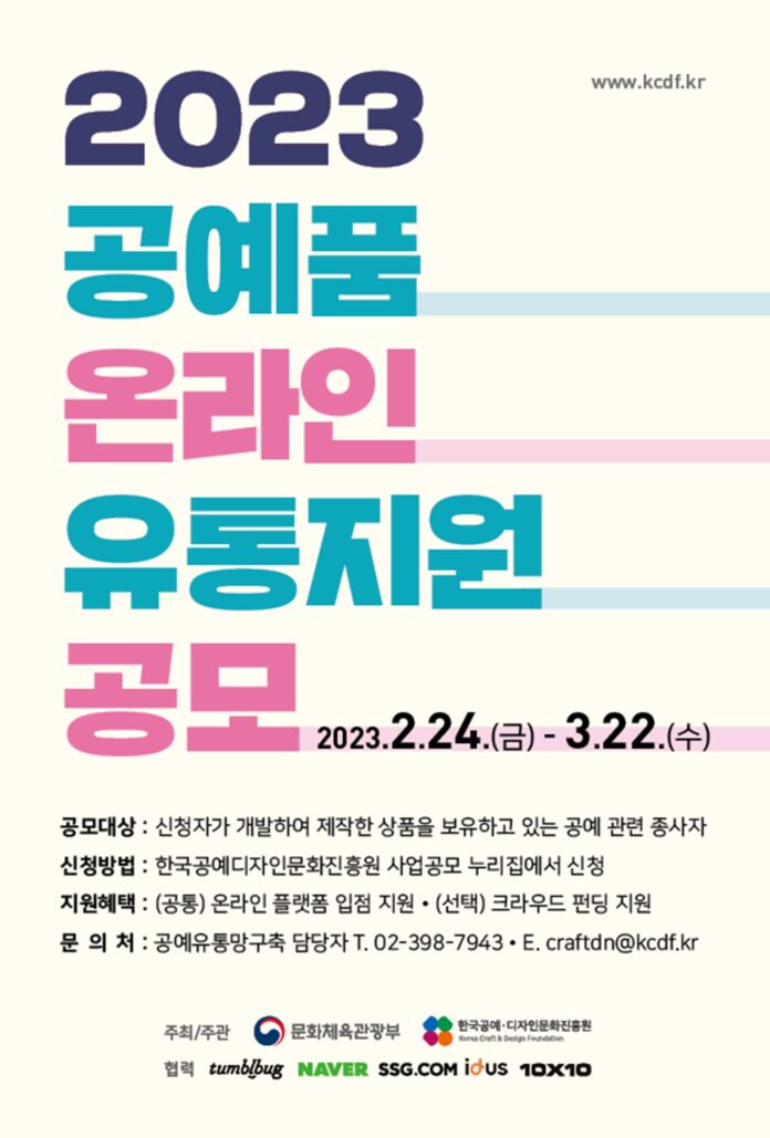 ‘2023 공예품 온라인 유통지원 공모’는 직접 개발하여 제작한 공예품을 보유하고 있는 공예 관련 종사자라면 누구나 참여할 수 있다. 오는 3월 22일까지 공진원 사업 공모 누리집을 통해 신청 가능하다.