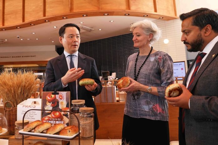 허진수 SPC사장(왼쪽)이 타마라 모휘니 (Tamara Mawhinney) 주한캐나다대사관 대사대리, 딘 디아스(Dean Dias) 캐나다 곡물협회 회장과 ‘두번쫄깃 베이글’ 체 험방문 행사를 마치고 기념촬영을 하고 있다.