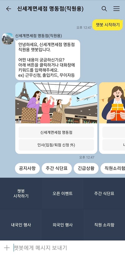 신세계면세점은 협력사원들의 업무를 지원하기 위한 챗봇 시스템을 명동점에서 선 운영한 후 향후 인천공항점, 부산점까지 확장하여 도입할 계획이다.