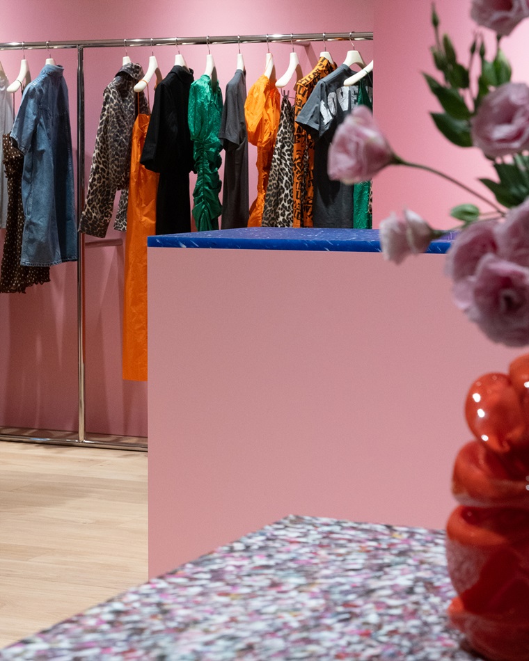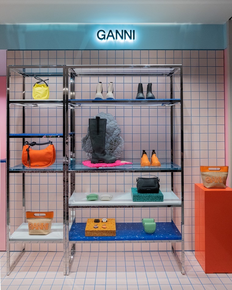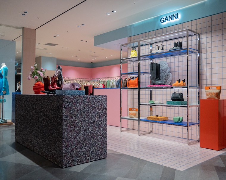 가니는 덴마크의 리빙 공간에서 영감 받아 누구나 시간을 보내기 좋은 공간으로 매장을 꾸몄다. 재생에너지로 가동할 수 있는 재생 소재를 사용해 인테리어에 활용했다.핑크, 스카이 블루 등의 컬러를 토대로 생기있고 즐거움 가득한 분위기를 연출했다.
