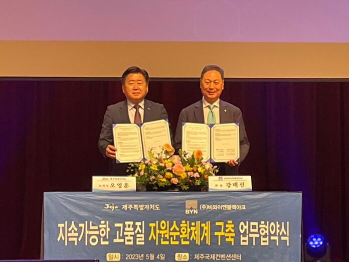 4일(목) 강태선 블랙야크 회장과 오영훈 제주도지사는 제주국제컨벤션센터에서 진행된 협약식에 참석해 ‘지속가능한 고품질 자원순환체계 구축’을 위한 업무 협약을 체결했다.